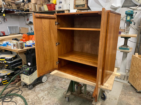 Een hoge eikenhoutenkast op maat gemaakt. In de kast zijn stroompunten en ledverlichting verwerkt.