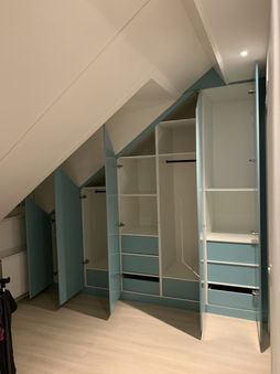 Deze strakke zolderkast is speciaal gemaakt voor een schuine wand zodat de ruimte optimaal benut wordt. In het middel is een mooie open ruimte gecreëerd van eikenhout.